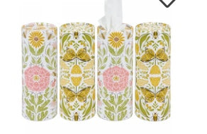 Set of 4 cylindrical tissue boxes displaying full wrap around designs of intricate floral and insect patterns. Perfect size and shape for placing in a car cup holder. 50 facial tissues per box.
